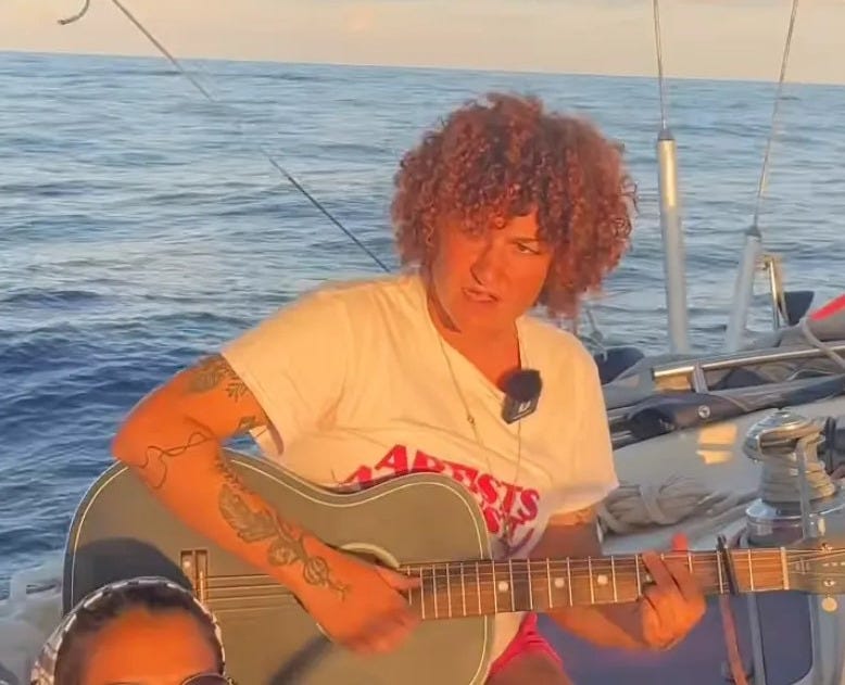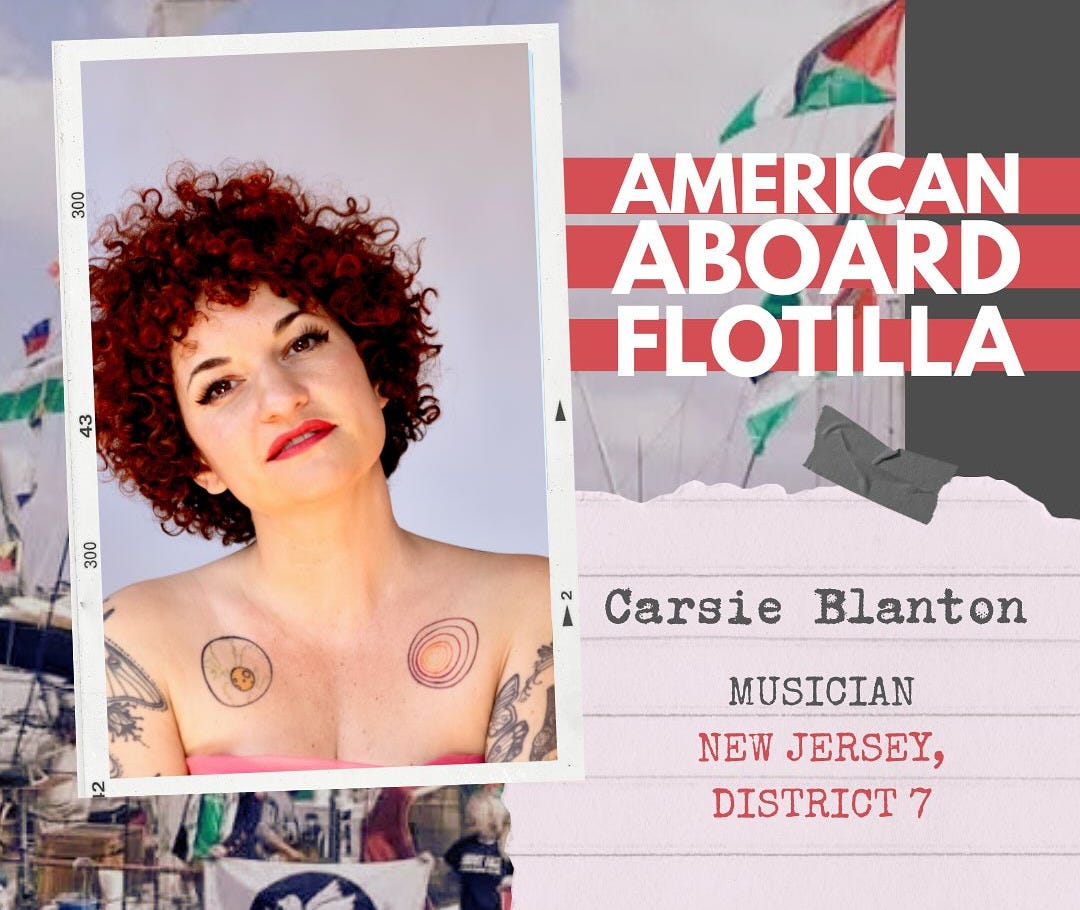 Carsie is a songwriter whose music spans folk, swing, punk and protest songs. One of her advertisements for her West Coast tour in February proclaims, in a makeshift newspaper headline, “Protest Music Is Not Dead.” She promises to sing “music to inspire revolutionary optimism instead of more boring useless nihilism.” Her October tour was postponed due to her capture and imprisonment by Israeli soldiers. Each participant made a video to be released in the event of their capture. In Carsie’s video, posted on her Instagram account, she says: “I am an American citizen. I am a Jewish person. And I’m a musician. And for all of those reasons I consider it my duty to try and make a problem for my own government because my government is enabling a genocide in Gaza.” She hopes viewers of her video can “also make a problem for your government. You can try to organize with many other people and try to make it politically impossible for them to keep supporting the genocide.”